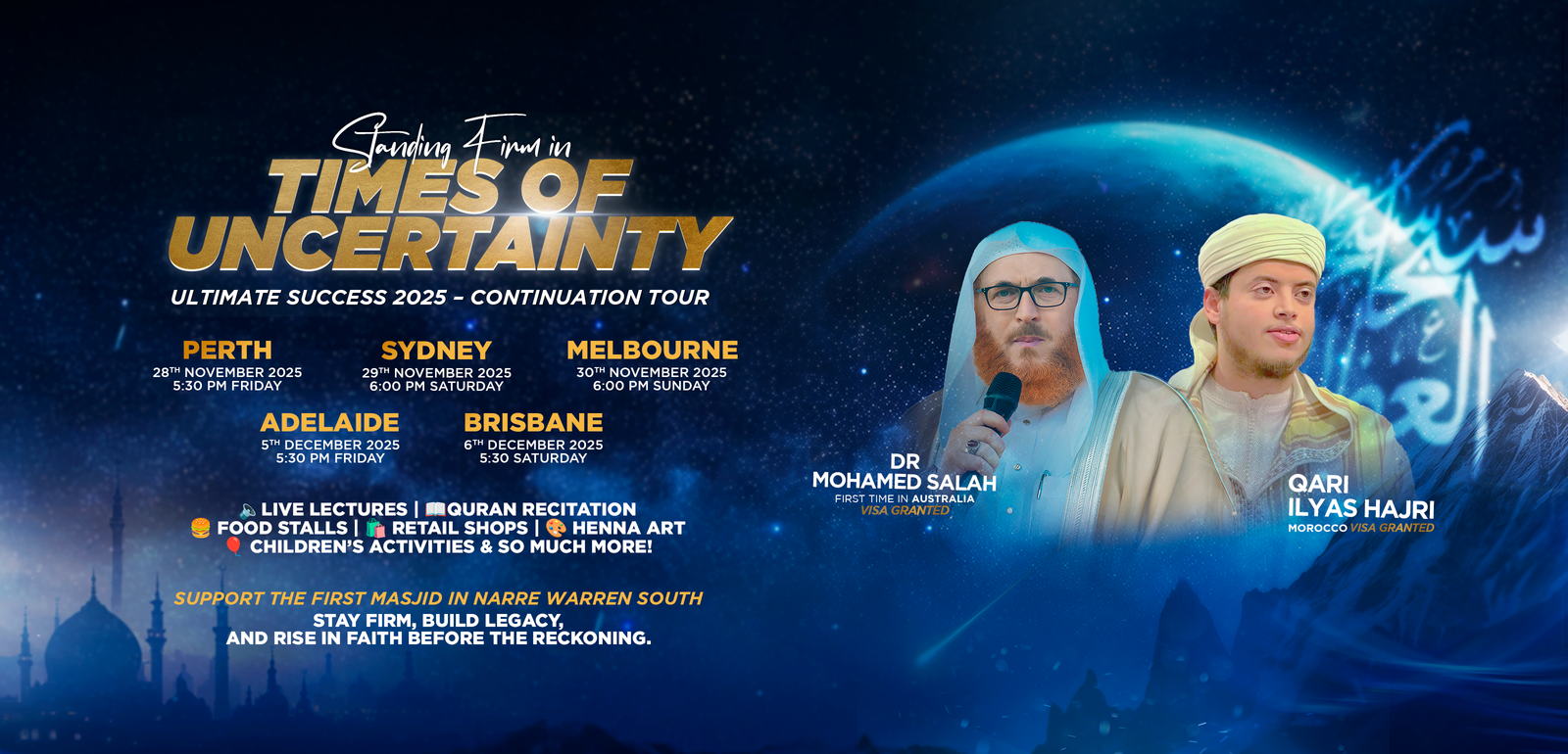 An incredible opportunity to attend, grow, and gain barakah by joining The Ultimate Success 2025 Australian Tour. By booking your ticket, you’ll become part of a transformative and inspiring event that nourishes the soul, strengthens community bonds, and offers deep spiritual reflection.
